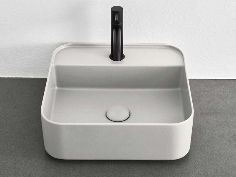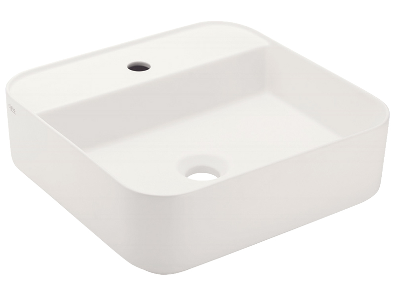 CIELO SHUI COMFORT SHCOLAQF Раковина накладная или подвесная с одним отверстием под смеситель с возможностью выполнения трех отверстий, без слива- перелива. В комплекте с крепежами. Одна сторона не покрыта эмалью. Размеры: 44x43x13h см. Цвет Talco.