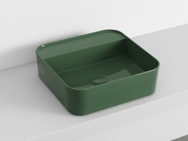 CIELO SHUI COMFORT SHCOLAQF Раковина накладная или подвесная без отверстия под смеситель, без слива- перелива. В комплекте с крепежами. Одна сторона не покрыта эмалью. Размеры: 44x43x13h см. Цвет Alga.