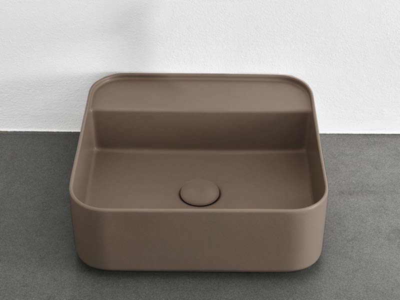 CIELO SHUI COMFORT SHCOLAQF Раковина накладная или подвесная без отверстия под смеситель, без слива- перелива. В комплекте с крепежами. Одна сторона не покрыта эмалью. Размеры: 44x43x13h см. Цвет Arenaria.