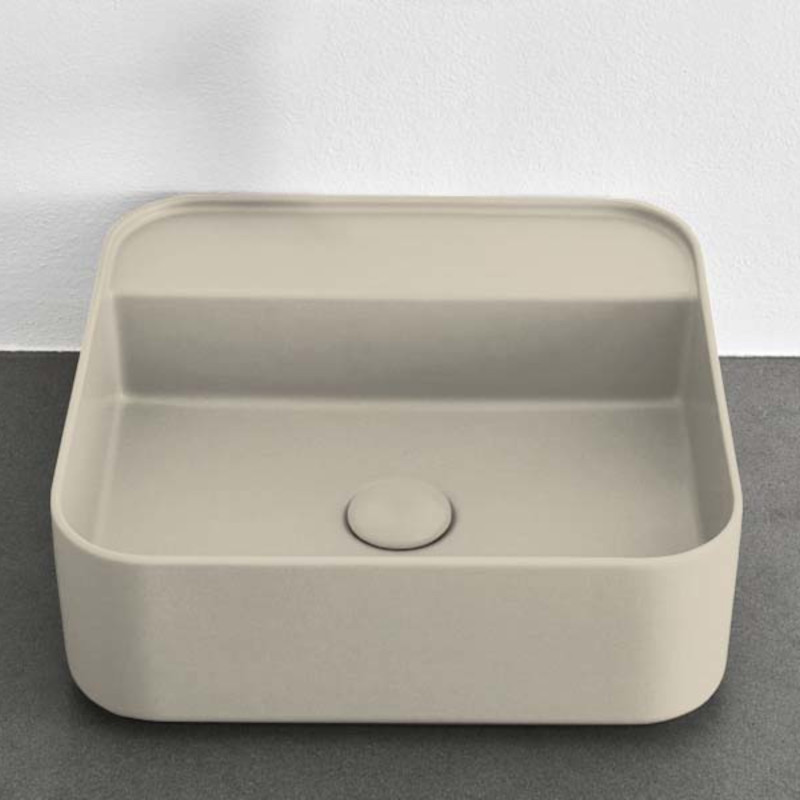 CIELO SHUI COMFORT SHCOLAQF Раковина накладная или подвесная без отверстия под смеситель, без слива- перелива. В комплекте с крепежами. Одна сторона не покрыта эмалью. Размеры: 44x43x13h см. Цвет Lino.