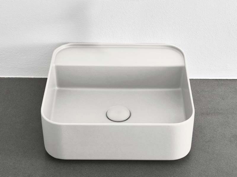 CIELO SHUI COMFORT SHCOLAQF Раковина накладная или подвесная без отверстия под смеситель, без слива- перелива. В комплекте с крепежами. Одна сторона не покрыта эмалью. Размеры: 44x43x13h см. Цвет Talco.