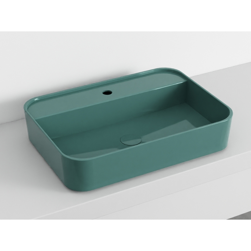 CIELO Shui Comfort SHCOLARF Раковина накладная или подвесная с одним отверстием под смеситель с возможностью выполнения трех отверстий, без слива-перелива. Крепления в комплекте. Одна сторона не покрыта эмалью. Размер 60х43х13h см. Цвет Smeraldo.