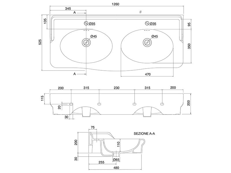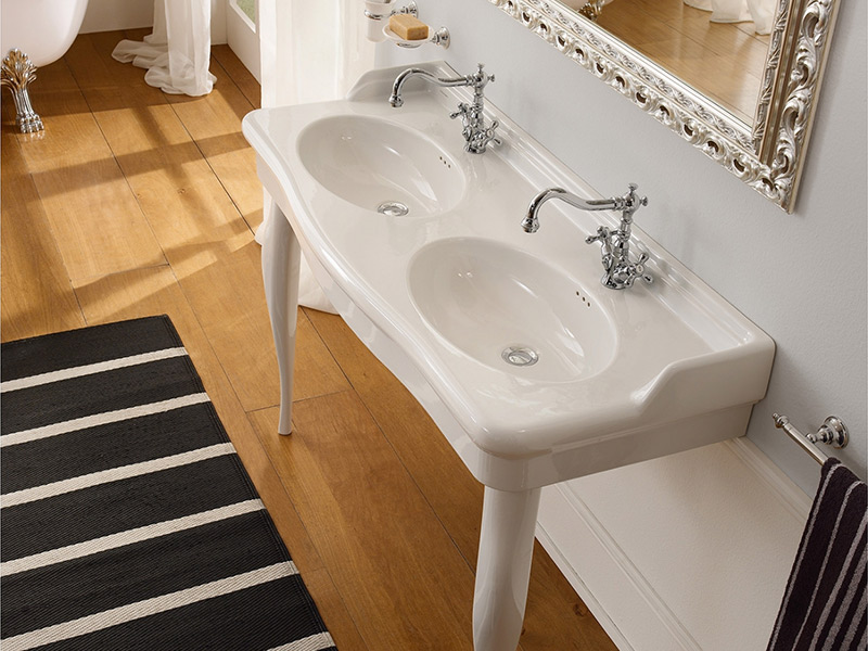 SCARABEO CASTELLANA 5303 Раковина накладная или подвесная двойная, две чаши без отверстия под смеситель, без перелива. Размеры: 126x52,5x20h см. Настенные крепления входят в комплект. Цвет белый глянцевый.
