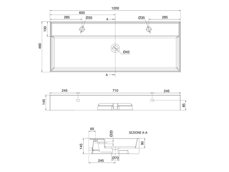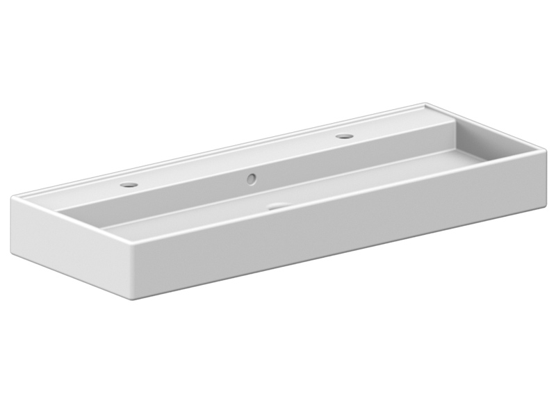 SCARABEO TEOREMA 2.0 5107/R-120B Раковина накладная или подвесная с двумя отверстиями под смеситель, с сливом - переливом. Размеры: 120x46x14,5h см. Настенные крепления входят в комплект. Цвет White.