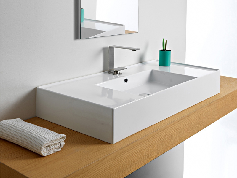 SCARABEO TEOREMA 2.0 DOUBLE SHELF 5124 Раковина накладная или подвесная, чаша посередине, одно отверстие под смеситель, с сливом - переливом. Настенные крепления и перелив входят в комплект. Размеры: 101x46x14h см. Цвет White.