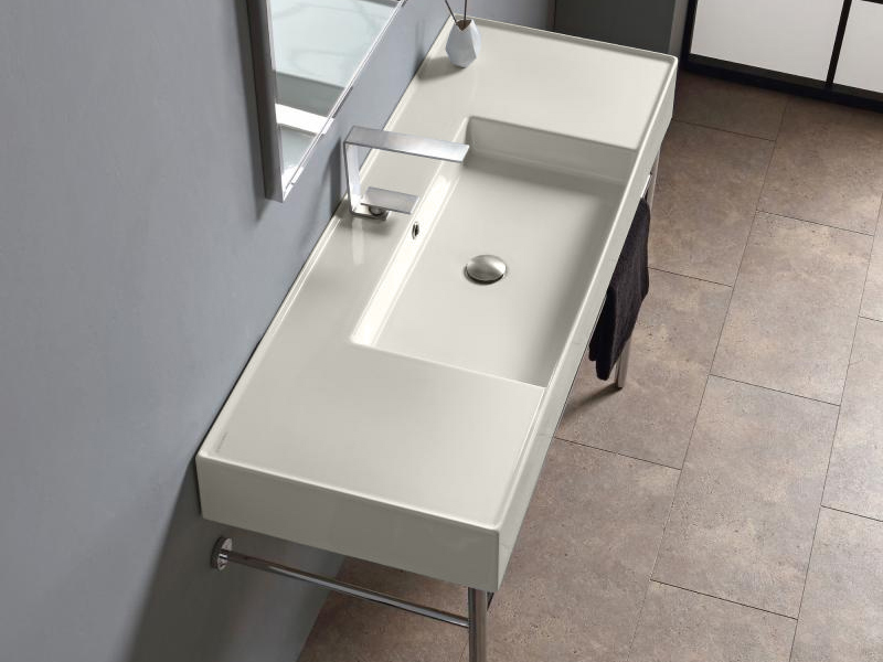 SCARABEO TEOREMA 2.0 DOUBLE SHELF 5125 Раковина накладная или подвесная чаша посередине, одно отверстие под смеситель, с сливом - переливом. Размеры: 121x46x14h см. Настенные крепления входят в комплект. Цвет Pearl.
