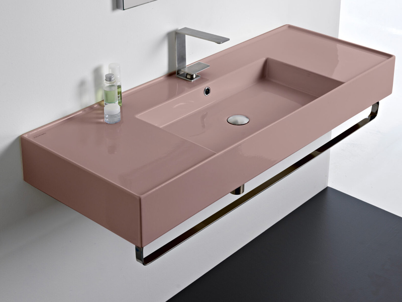 SCARABEO TEOREMA 2.0 DOUBLE SHELF 5125 Раковина накладная или подвесная чаша посередине, одно отверстие под смеситель, с сливом - переливом. Размеры: 121x46x14h см. Настенные крепления и перелив входят в комплект. Цвет Glossy Antique pink.