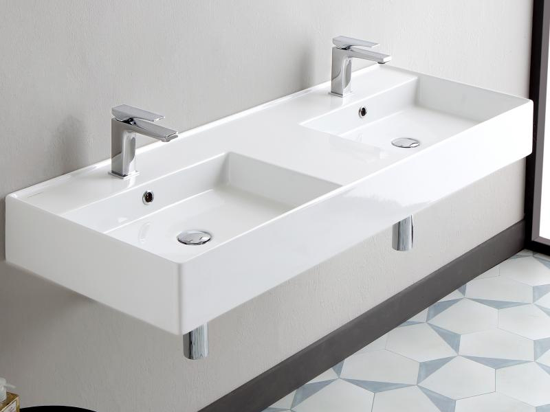 SCARABEO TEOREMA 2.0 5143 Раковина накладная или подвесная двойная, две чаши, два отверстия под смеситель, с сливом-переливом. Размеры: 121,5x46x14h см. Настенные крепления входят в комплект. Цвет White.