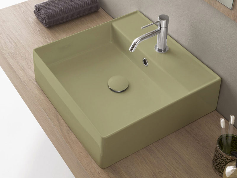 SCARABEO TEOREMA 2.0 5104 Раковина накладная или подвесная с одним отверстием под смеситель, с сливом - переливом. Настенные крепления и перелив входят в комплект. Размеры: 46x46x14,5h см. Цвет Glossy lime.