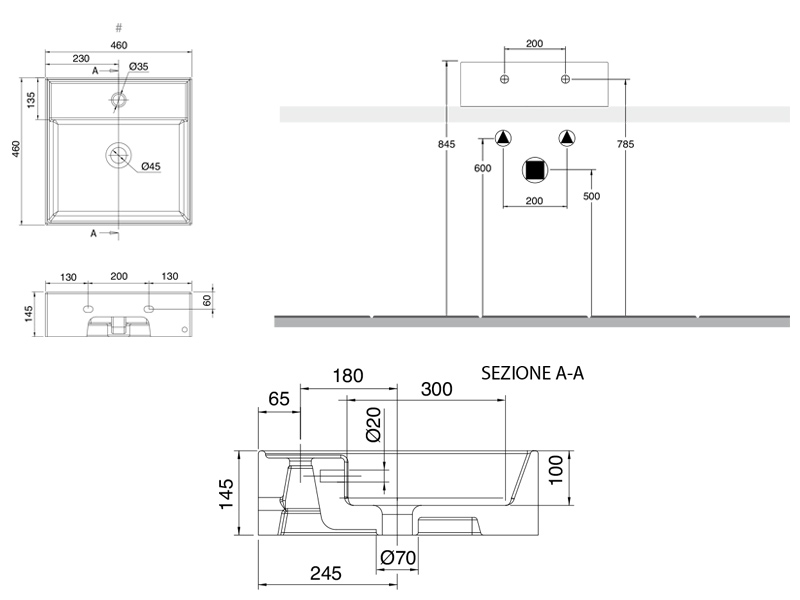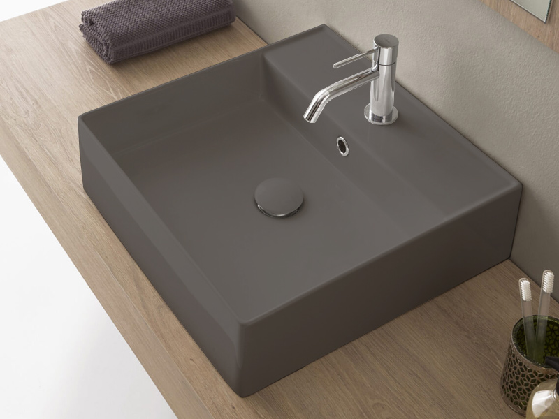 SCARABEO TEOREMA 2.0 5104 Раковина накладная или подвесная с одним отверстием под смеситель, с сливом - переливом. Настенные крепления и перелив входят в комплект. Размеры: 46x46x14,5h см. Цвет Tobacco.