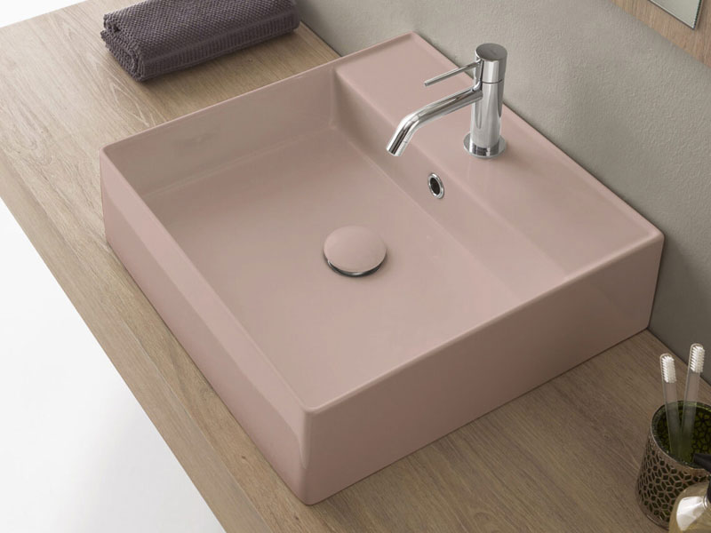 SCARABEO TEOREMA 2.0 5104 Раковина накладная или подвесная с одним отверстием под смеситель, с сливом - переливом. Настенные крепления и перелив входят в комплект. Размеры: 46x46x14,5h см. Цвет Antique pink.