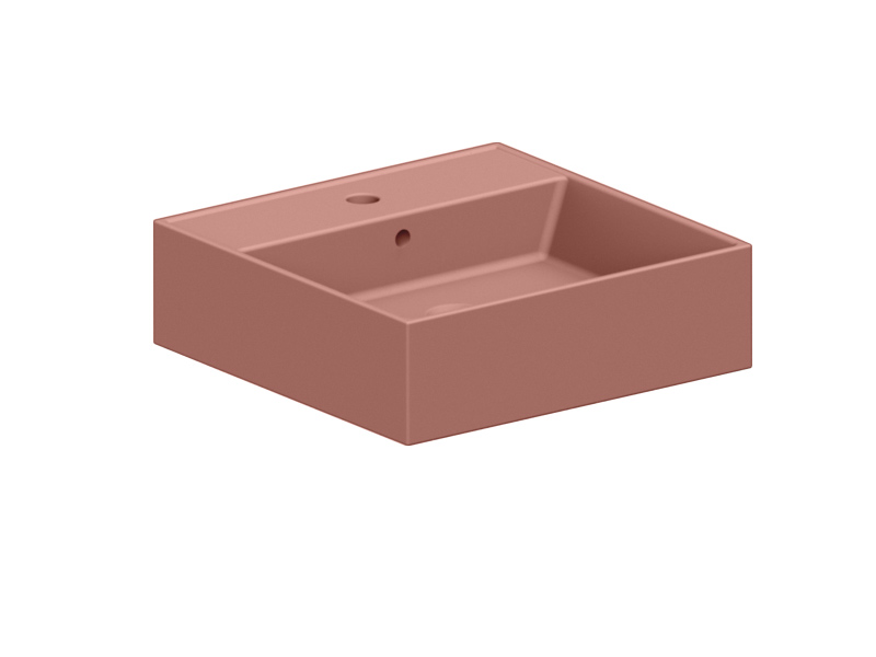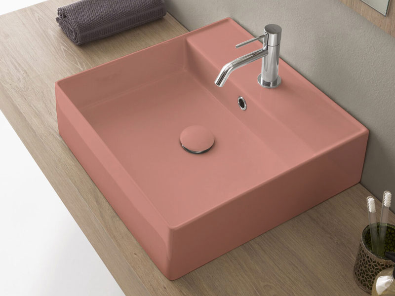 SCARABEO TEOREMA 2.0 5104 Раковина накладная или подвесная с одним отверстием под смеситель, с сливом - переливом. Настенные крепления и перелив входят в комплект. Размеры: 46x46x14,5h см. Цвет Matt peach.