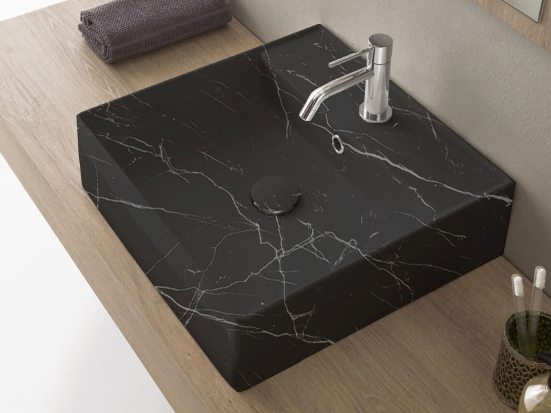 SCARABEO TEOREMA 2.0 5104 Раковина накладная или подвесная с одним отверстием под смеситель, с сливом - переливом. Настенные крепления и перелив входят в комплект. Размеры: 46x46x14,5h см. Цвет Marble Black.
