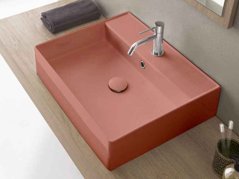 SCARABEO TEOREMA 2.0 5105 Раковина накладная или подвесная с одним отверстием под смеситель, с сливом - переливом. Настенные крепления и перелив входят в комплект. Размеры: 60x46x14,5h см. Цвет Glossy Peach.