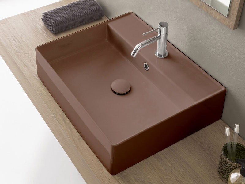 SCARABEO TEOREMA 2.0 5105 Раковина накладная или подвесная с одним отверстием под смеситель, с сливом - переливом. Настенные крепления и перелив входят в комплект. Размеры: 60x46x14,5h см. Цвет Glossy Tobacco.