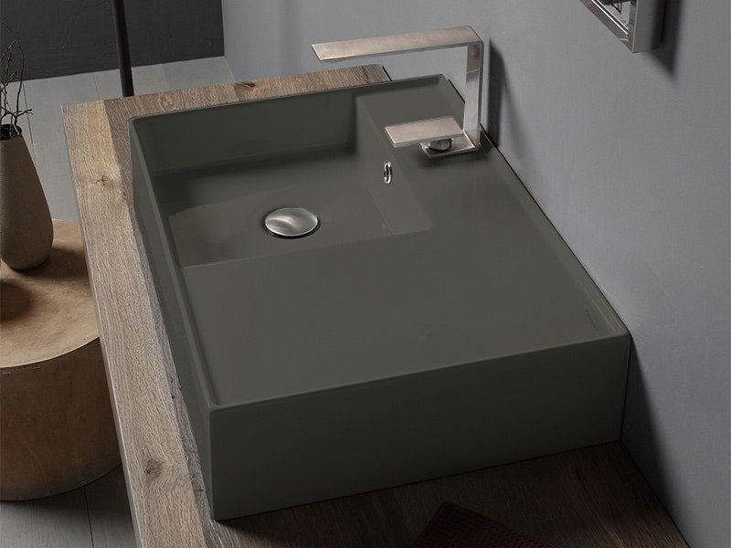 SCARABEO TEOREMA 2.0 5114 Раковина накладная или подвесная чаша слева с одним отверстием под смеситель, с сливом - переливом. Размеры: 60x44x14h см. Настенные крепления входят в комплект. Цвет Ardesia.