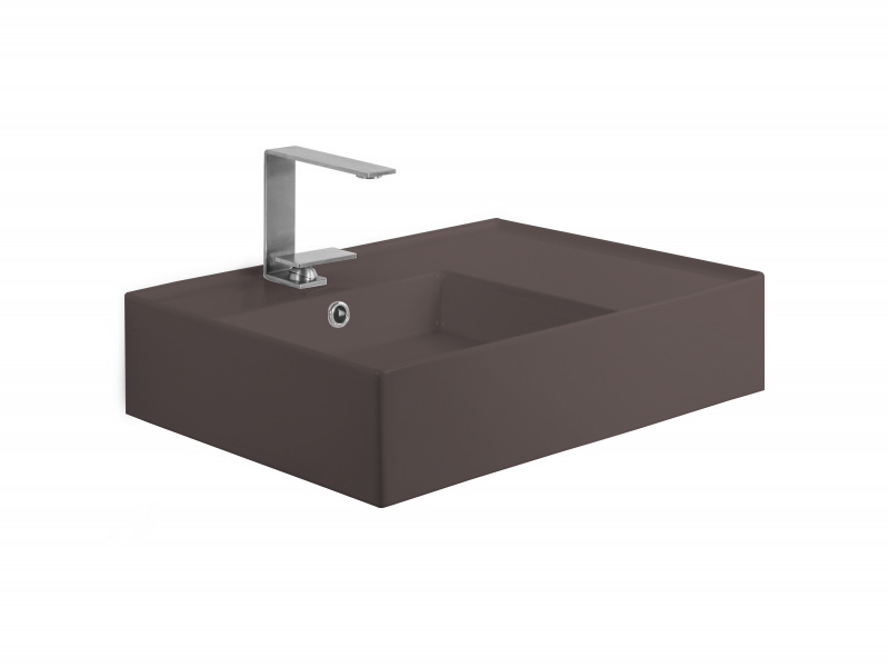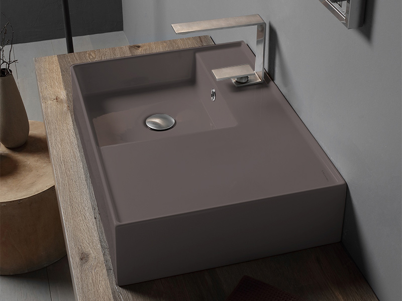SCARABEO TEOREMA 2.0 5114 Раковина накладная или подвесная чаша слева с одним отверстием под смеситель, с сливом - переливом. Размеры: 60x44x14h см. Настенные крепления входят в комплект. Цвет Tobacco.