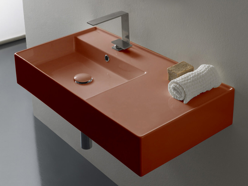 SCARABEO TEOREMA 2.0 5115 Раковина накладная или подвесная чаша слева с одним отверстием под смеситель, с сливом - переливом. Настенные крепления и перелив входят в комплект. Цвет .Размеры: 80x44x14h см. Цвет Glossy Peach.