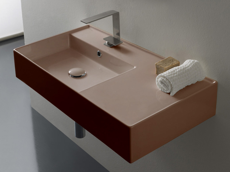 SCARABEO TEOREMA 2.0 5115 Раковина накладная или подвесная чаша слева с одним отверстием под смеситель, с сливом - переливом. Настенные крепления и перелив входят в комплект. Цвет .Размеры: 80x44x14h см. Цвет Glossy Antique pink.