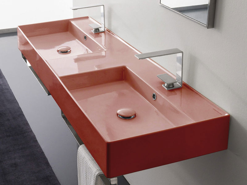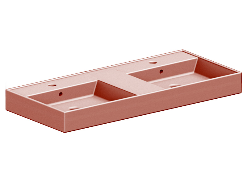 SCARABEO TEOREMA 2.0 5116 Раковина накладная или подвесная двойная, две чаши, два отверстия под смеситель, с сливом - переливом. Размеры: 141,5x46x14h см. Настенные крепления и переливы входят в комплект. Цвет Glossy Peach .