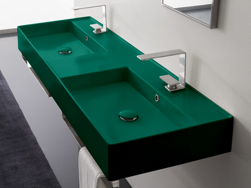 SCARABEO TEOREMA 2.0 5116 Раковина накладная или подвесная двойная, две чаши, два отверстия под смеситель, с сливом - переливом. Размеры: 141,5x46x14h см. Настенные крепления и переливы входят в комплект. Цвет Tobacco.