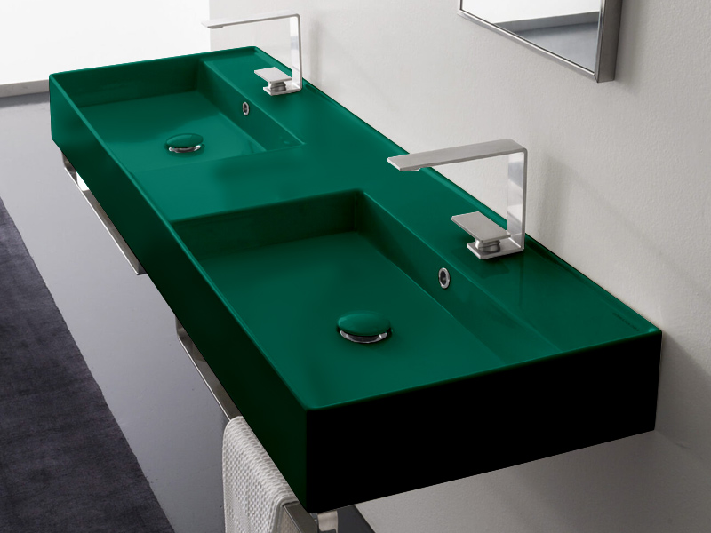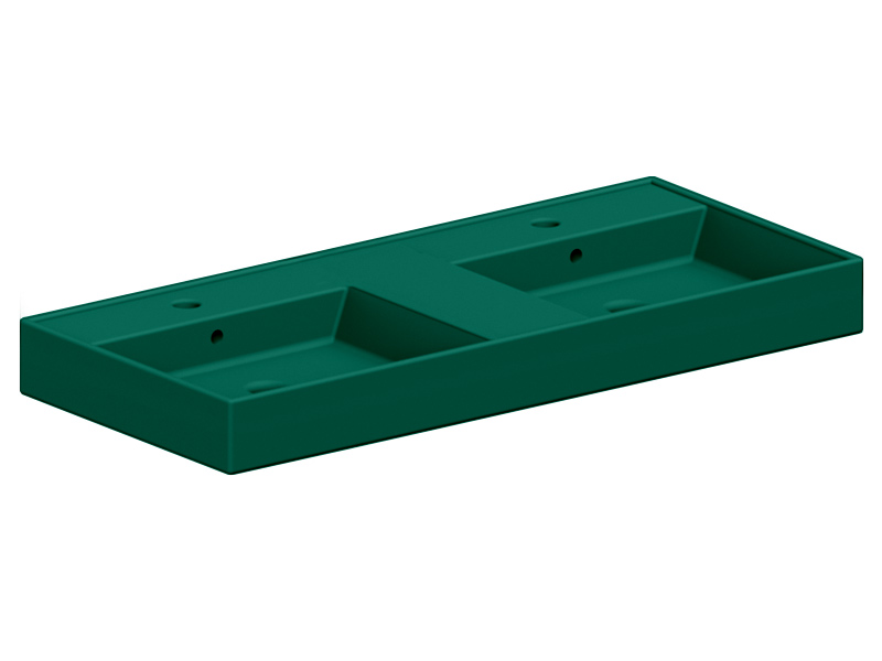 SCARABEO TEOREMA 2.0 5116 Раковина накладная или подвесная двойная, две чаши, два отверстия под смеситель, с сливом - переливом. Размеры: 141,5x46x14h см. Настенные крепления и переливы входят в комплект. Цвет musk.