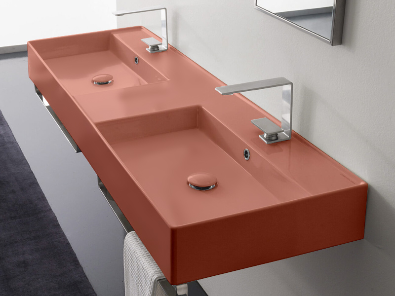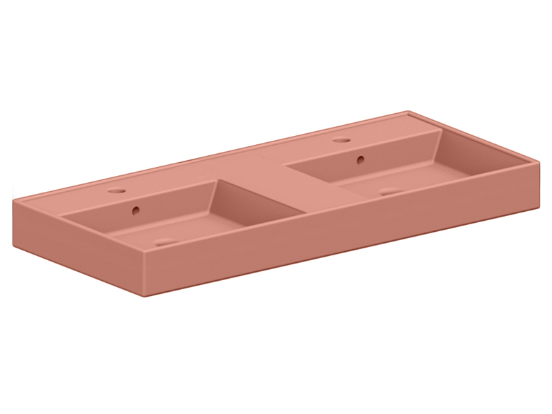 SCARABEO TEOREMA 2.0 5116 Раковина накладная или подвесная двойная, две чаши, два отверстия под смеситель, с сливом - переливом. Размеры: 141,5x46x14h см. Настенные крепления и переливы входят в комплект. Цвет Matt Peach.