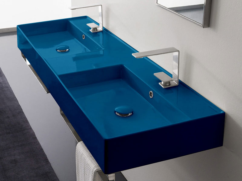 SCARABEO TEOREMA 2.0 5116 Раковина накладная или подвесная двойная, две чаши, два отверстия под смеситель, с сливом - переливом. Размеры: 141,5x46x14h см. Настенные крепления и переливы входят в комплект. Цвет Glossy Ocean.