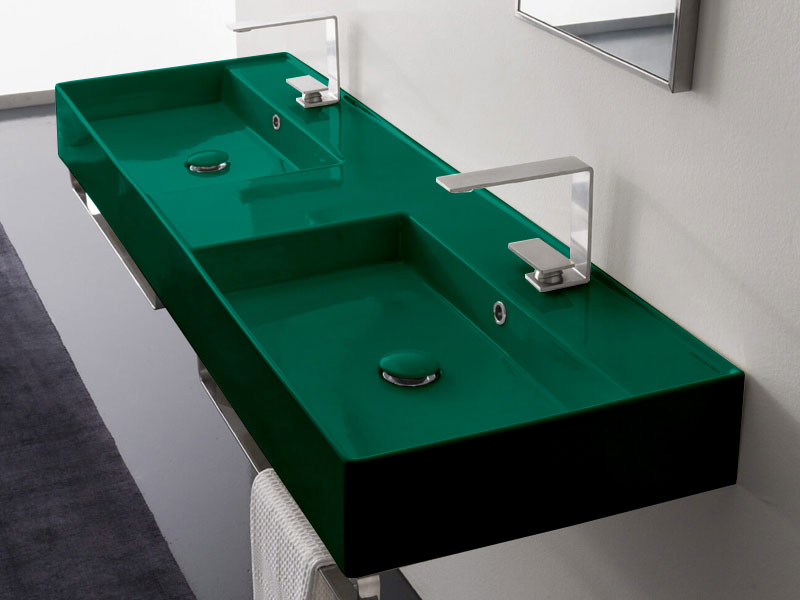 SCARABEO TEOREMA 2.0 5116 Раковина накладная или подвесная двойная, две чаши, два отверстия под смеситель, с сливом - переливом. Размеры: 141,5x46x14h см. Настенные крепления и переливы входят в комплект. Цвет Glossy musk.