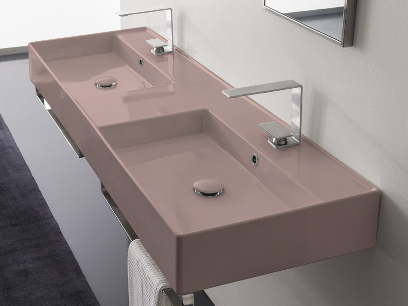 SCARABEO TEOREMA 2.0 5116 Раковина накладная или подвесная двойная, две чаши, два отверстия под смеситель, с сливом - переливом. Размеры: 141,5x46x14h см. Настенные крепления и переливы входят в комплект. Цвет Glossy Antique pink .