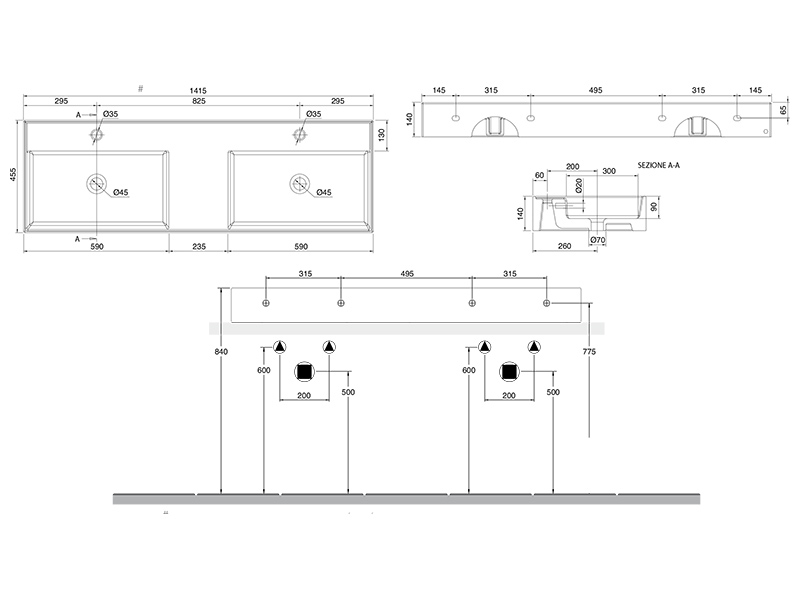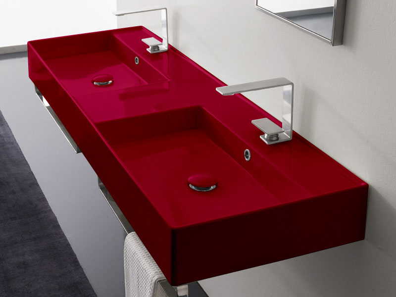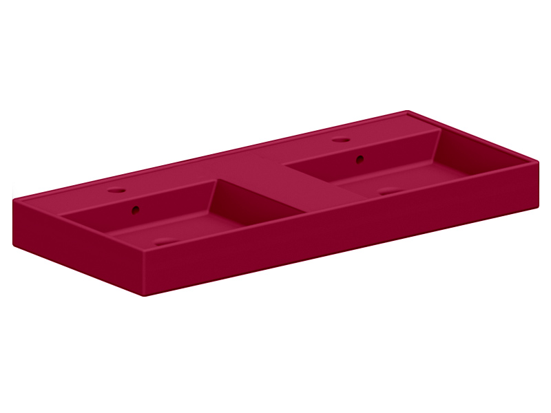 SCARABEO TEOREMA 2.0 5116 Раковина накладная или подвесная двойная, две чаши, два отверстия под смеситель, с сливом - переливом. Размеры: 141,5x46x14h см. Настенные крепления и переливы входят в комплект. Цвет Cherry .