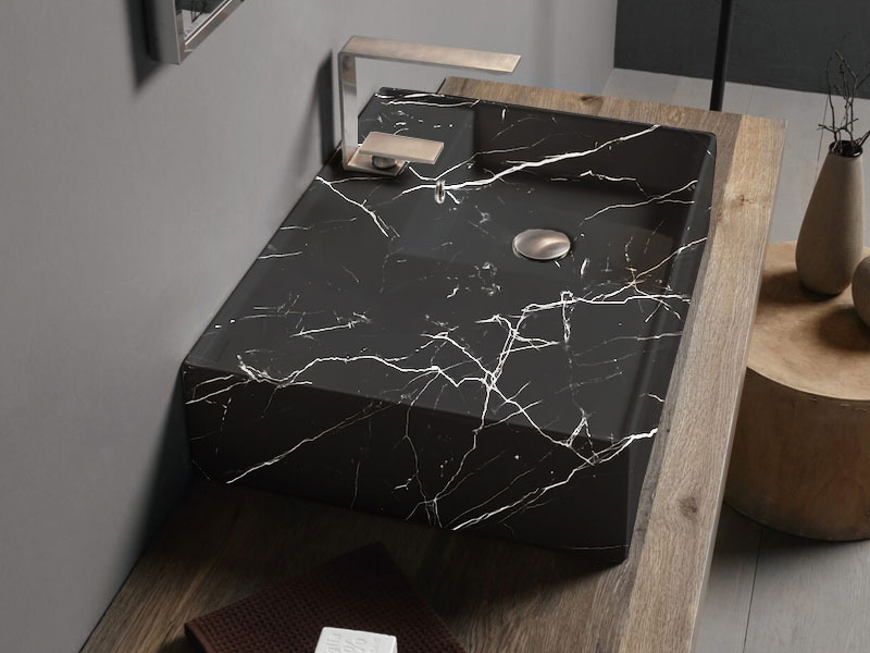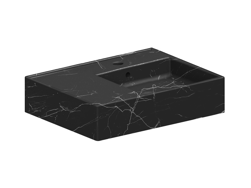 SCARABEO TEOREMA 2.0 5117 Раковина накладная или подвесная чаша справа, одно отверстие под смеситель, с сливом - переливом. Размеры: 60x44x14h см. Настенные крепления и перелив входят в комплект. Цвет Marble Black.