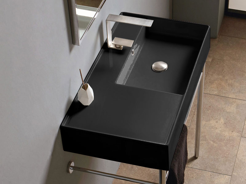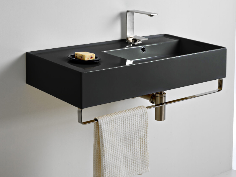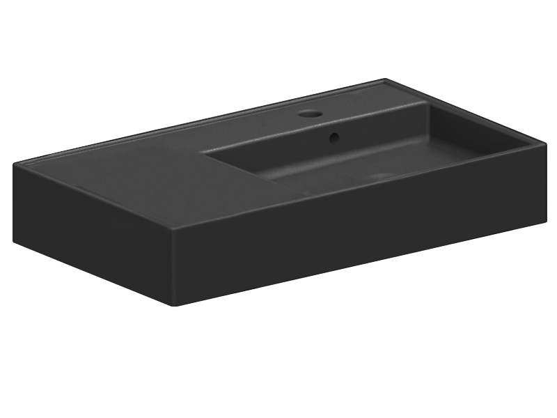 SCARABEO TEOREMA 2.0 5118 Раковина накладная или подвесная, чаша справа, одно отверстие под смеситель, с сливом - переливом. Размеры: 80x44x14h см. Настенные крепления входят в комплект. Цвет Night.
