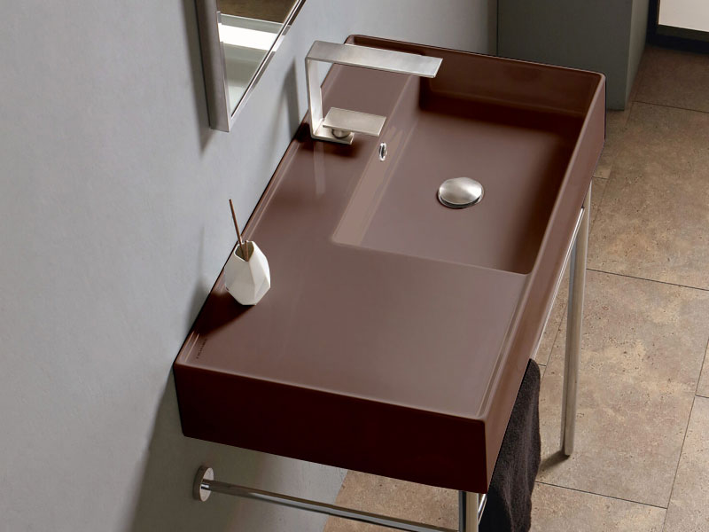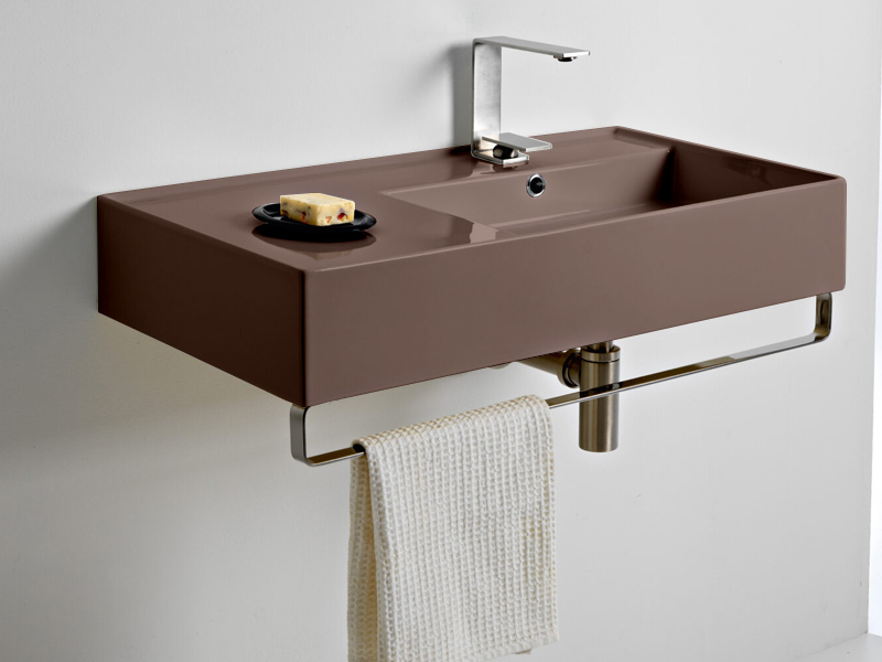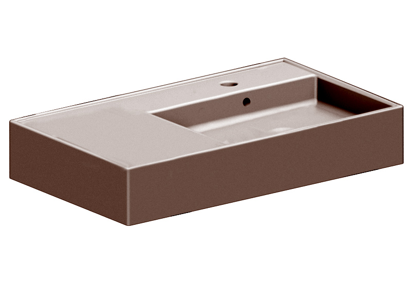 SCARABEO TEOREMA 2.0 5118 Раковина накладная или подвесная, чаша справа, одно отверстие под смеситель, с сливом - переливом. Размеры: 80x44x14h см. Настенные крепления входят в комплект. Цвет Glossy Tobacco.