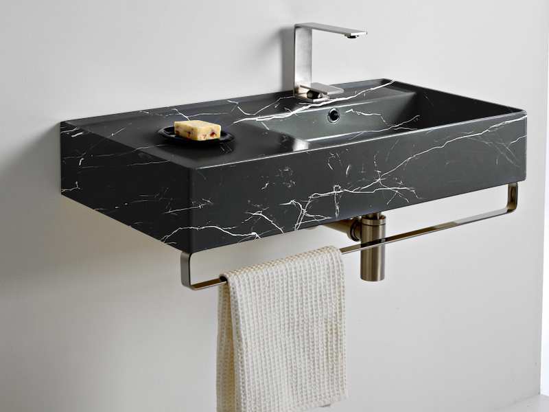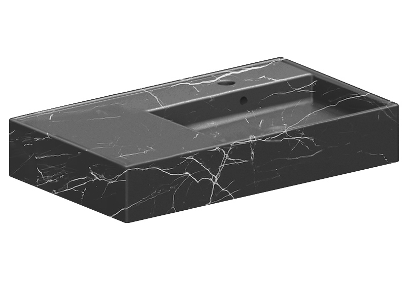 SCARABEO TEOREMA 2.0 5118 Раковина накладная или подвесная, чаша справа, одно отверстие под смеситель, с сливом - переливом. Размеры: 80x44x14h см. Настенные крепления входят в комплект. Цвет Marble Black.