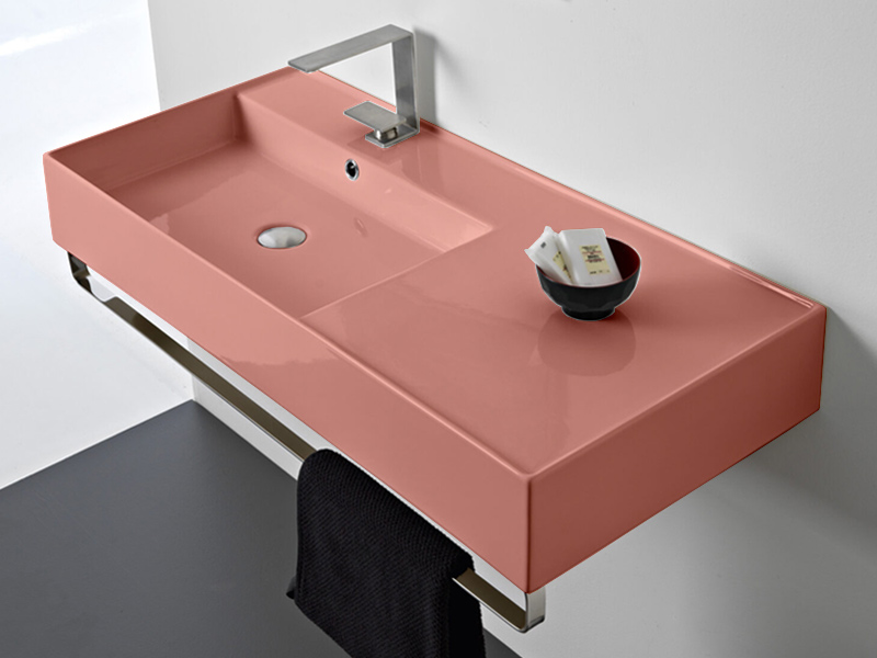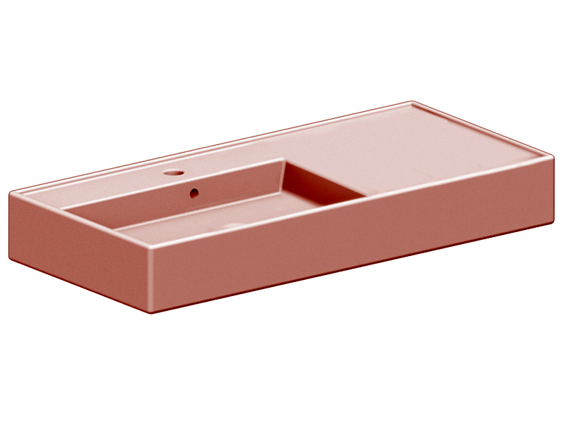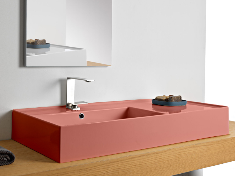 SCARABEO TEOREMA 2.0 5119 Раковина накладная или подвесная чаша слева, одно отверстие под смеситель, с сливом - переливом. Размеры: 101x46x14h см. Настенные крепления и перелив входят в комплект. Цвет Glossy Peach.