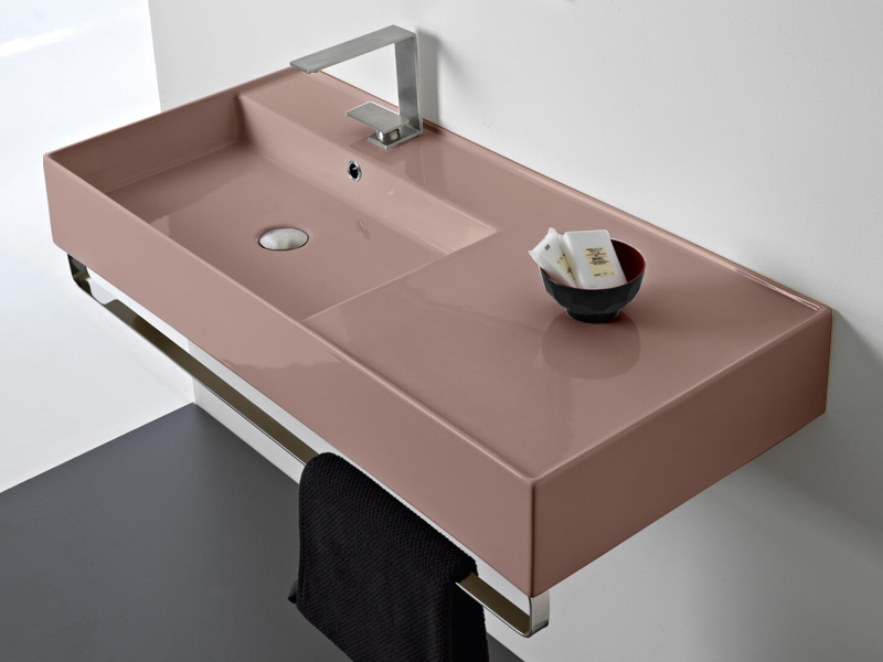 SCARABEO TEOREMA 2.0 5119 Раковина накладная или подвесная чаша слева, одно отверстие под смеситель, с сливом - переливом. Размеры: 101x46x14h см. Настенные крепления и перелив входят в комплект. Цвет Glossy Antique pink.