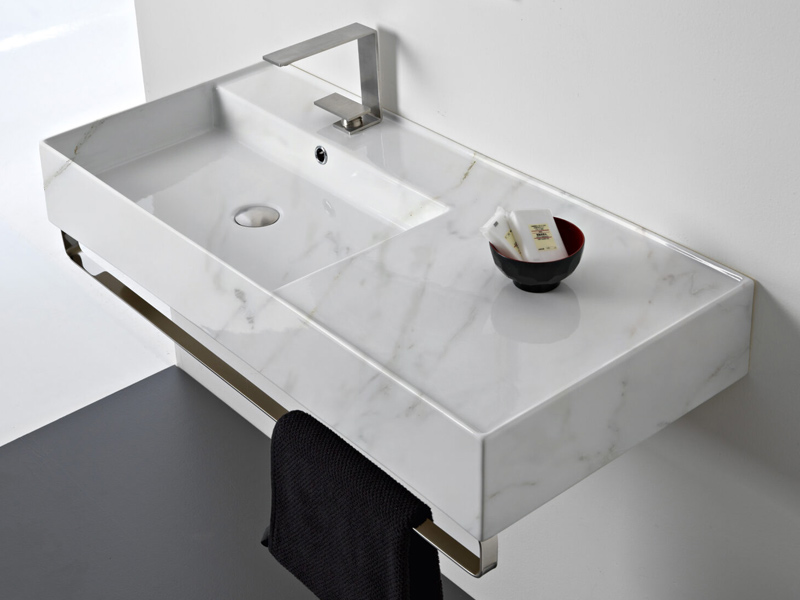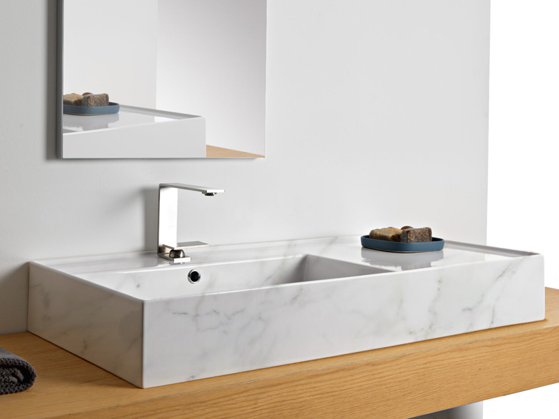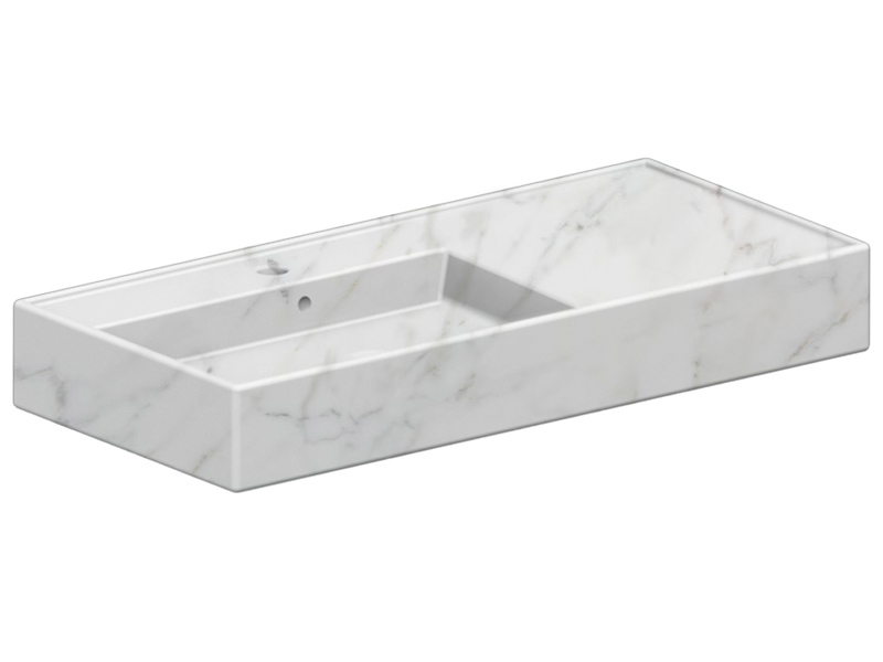 SCARABEO TEOREMA 2.0 5119 Раковина накладная или подвесная чаша слева, одно отверстие под смеситель, с сливом - переливом. Размеры: 101x46x14h см. Настенные крепления и перелив входят в комплект. Цвет Marble White.