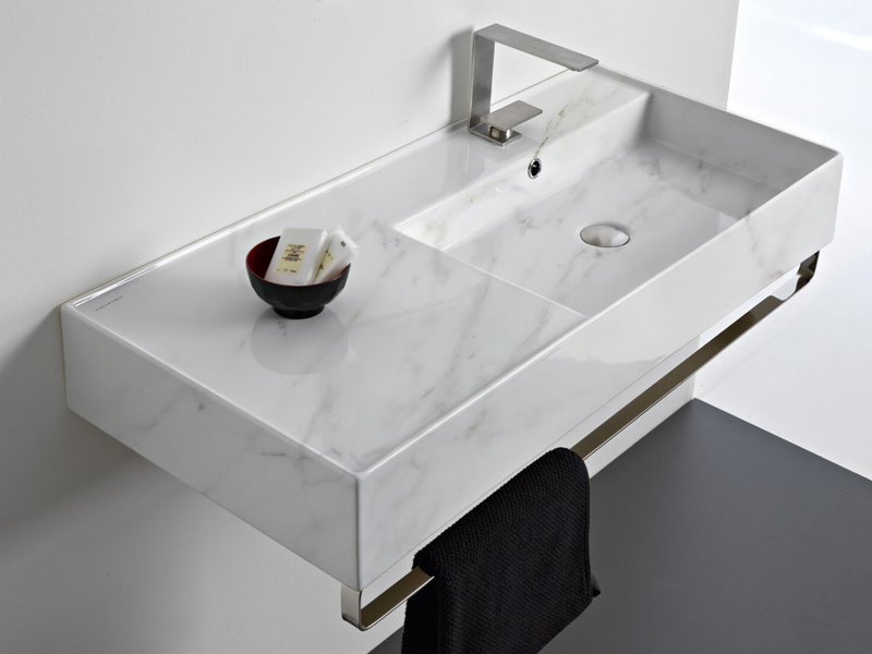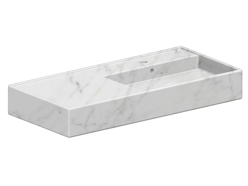 SCARABEO TEOREMA 2.0 5120 Раковина накладная или подвесная чаша справа, одно отверстие под смеситель, с сливом - переливом. Размеры: 101x46x14h см. Настенные крепления и перелив входят в комплект. Цвет Marble White.