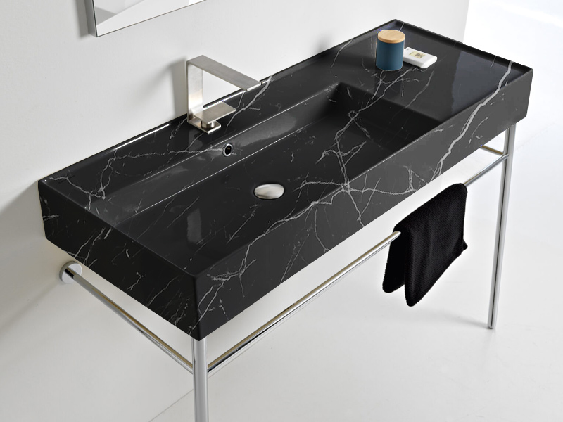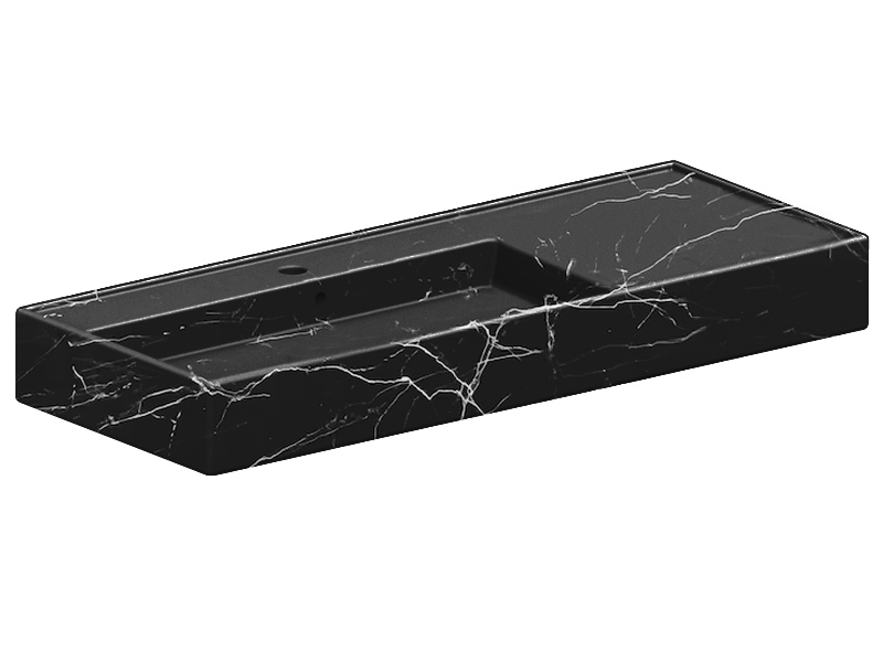 SCARABEO TEOREMA 2.0 5121 Раковина накладная или подвесная чаша слева, одно отверстие под смеситель, с сливом - переливом. Размеры: 121x46x14h см. Настенные крепления и перелив входят в комплект. Цвет Marble Black.