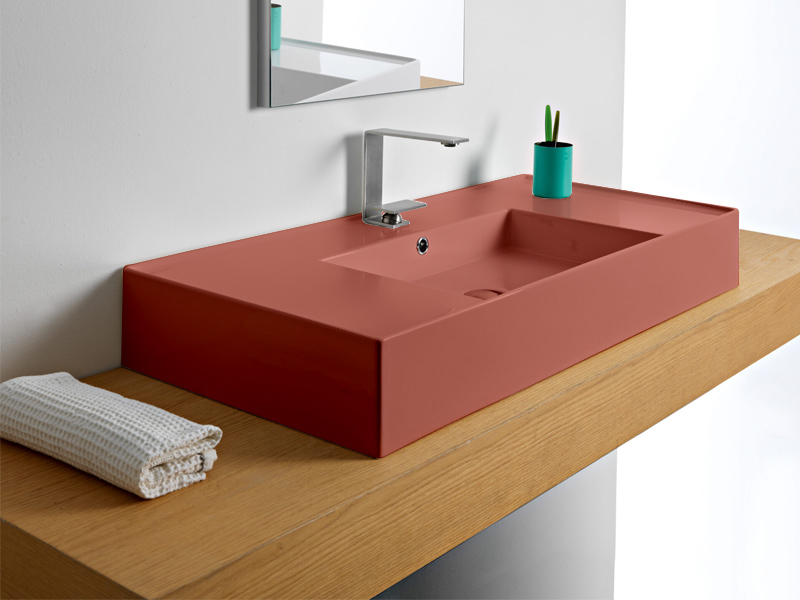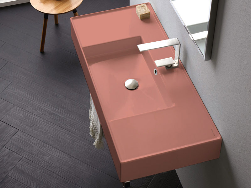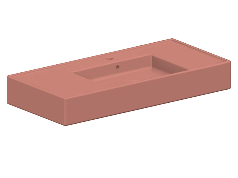 SCARABEO TEOREMA 2.0 DOUBLE SHELF 5124 Раковина накладная или подвесная чаша посередине, одно отверстие под смеситель, с сливом - переливом. Настенные крепления входят и перелив в комплект. Размеры: 101x46x14h см. Цвет Matt Peach.