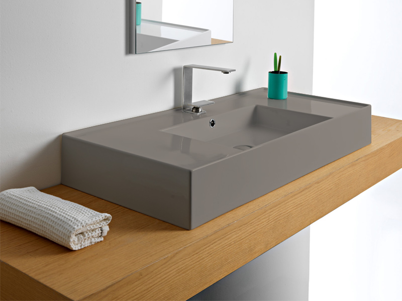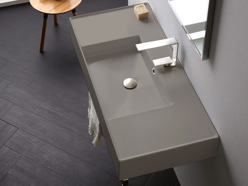 SCARABEO TEOREMA 2.0 DOUBLE SHELF 5124 Раковина накладная или подвесная чаша посередине, одно отверстие под смеситель, с сливом - переливом. Настенные крепления входят и перелив в комплект. Размеры: 101x46x14h см. Цвет Glossy sand.