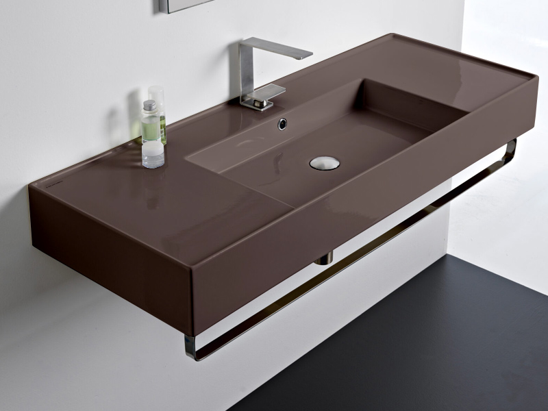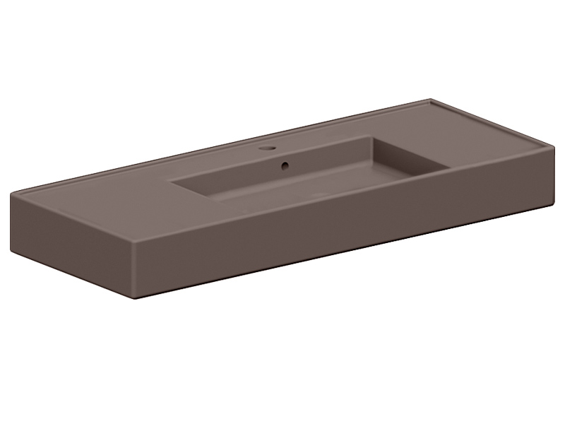 SCARABEO TEOREMA 2.0 DOUBLE SHELF 5125 Раковина накладная или подвесная чаша посередине, одно отверстие под смеситель, с сливом - переливом. Размеры: 121x46x14h см. Настенные крепления и перелив входят в комплект. Цвет Glossy Tobacco.