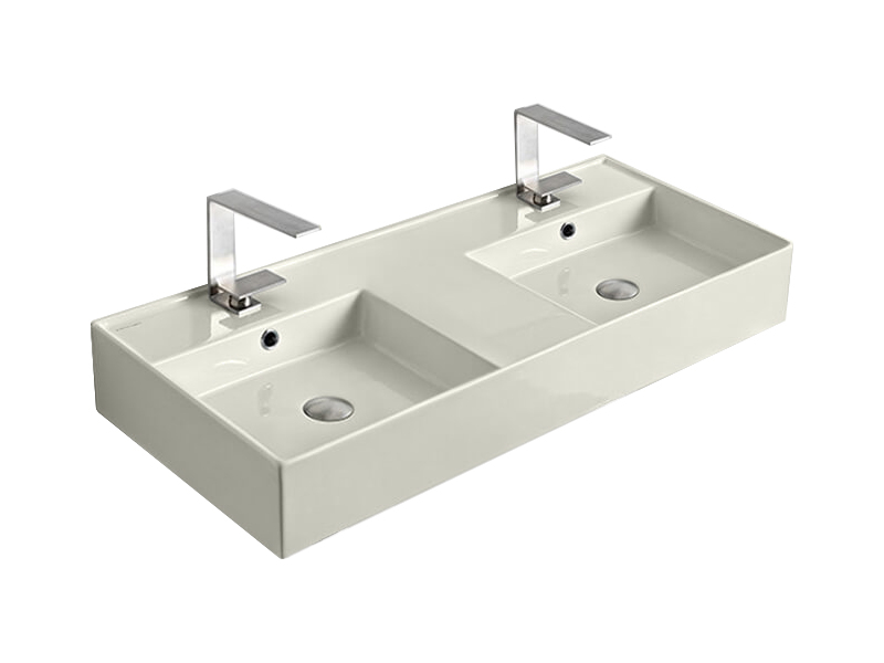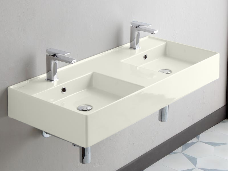 SCARABEO TEOREMA 2.0 5142 Раковина накладная или подвесная двойная, две чаши, два отверстия под смеситель, с сливом-переливом. Размеры: 101x46x14h см. Настенные крепления входят в комплект. Цвет Pearl.
