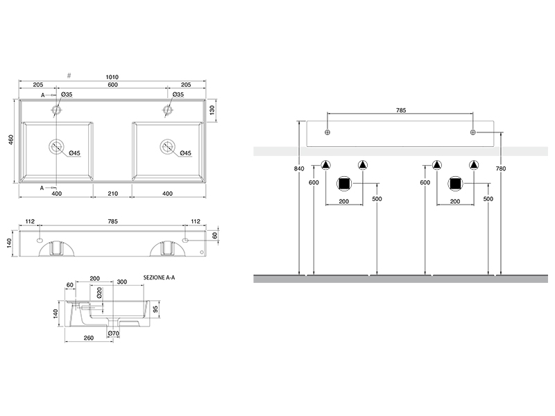 SCARABEO TEOREMA 2.0 5142 Раковина накладная или подвесная двойная. Две чаши, два отверстия под смеситель, с сливом-переливом. Размеры: 101x46x14h см. Настенные крепления и перелив входят в комплект. Цвет Glossy Antique pink.