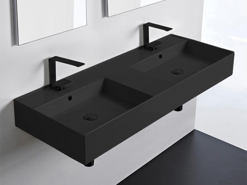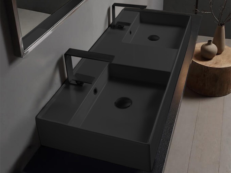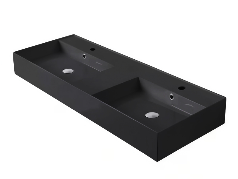 SCARABEO TEOREMA 2.0 5143 Раковина накладная или подвесная двойная, Две чаши, два отверстия под смеситель, с сливом-переливом. Размеры: 121,5x46x14h см. Настенные крепления и перелив входят в комплект. Цвет Night .