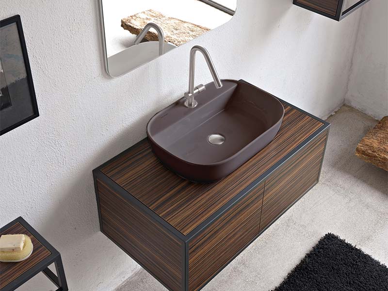 SCARABEO GLAM 56/R 1802 Раковина накладная без перелива с одним отверстием под смеситель. Рекомендуется установка на столешницу. Размеры: 56x38x14h см. Цвет Tobacco. Представленная модель раковины существует в различных цветовых решениях.