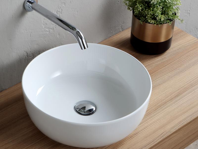 Раковина имеет круглую форму и выполнена в белом глянцевом цвете, что придаёт ей свежий и современный вид. Это решение идеально подходит как для классических интерьеров, так и для более смелых современных дизайнерских решений. Белый цвет не только смотрится стильно, но и легко комбинируется с различными отделками и цветами стен, создавая гармоничное пространство.