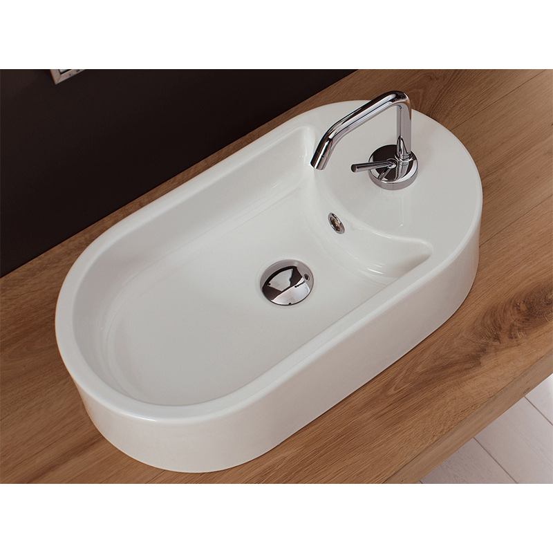 Керамическая овальная накладная раковина Scarabeo SEVENTY 8093 предлагает вам надежное качество, элегантный дизайн и прекрасную функциональность. Она придаст вашей ванной комнате шик и элегантность, создавая стильную и комфортную атмосферу.