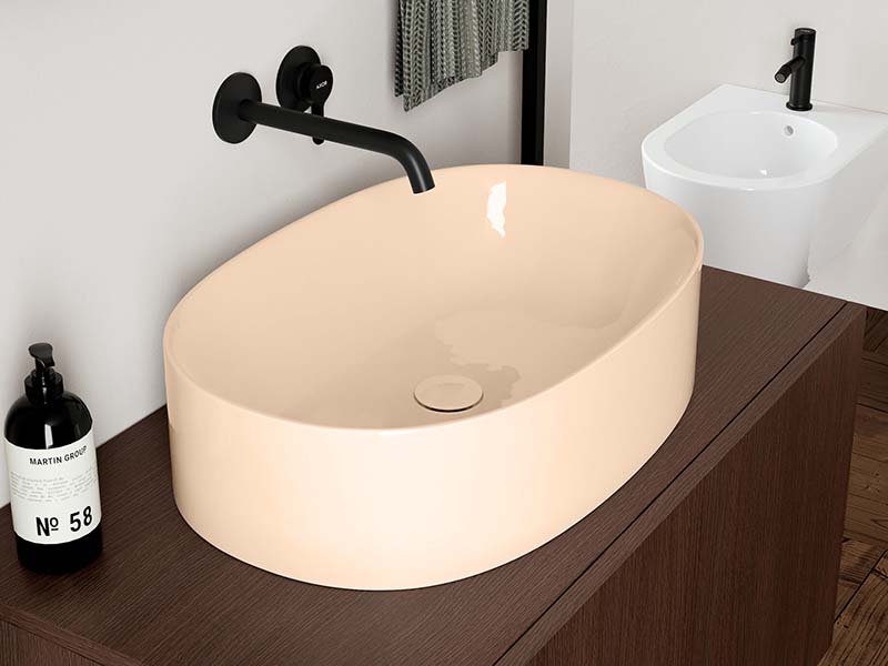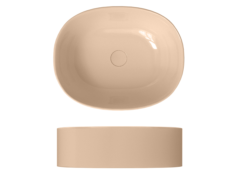 SCARABEO SKINNY 5408 Раковина накладная без отверстия под смеситель, без слива-перелива. Все стороны покрыты эмалью. Размеры: 50x40x15h см. Цвет Glossy peach.